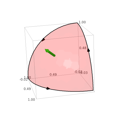 As linhas de $J_F\left(\frac{1}{\sqrt{6}},0,\frac{1}{3}\right)$ formam uma base para o espaço normal a $V$ em $\left(\frac{1}{\sqrt{6}},0,\frac{1}{3}\right)$. Tal permite identificar o espaço tangente no mesmo ponto como sendo formado por todos os vectores da forma $(0,\lambda,0)$ com $\lambda\in\mathbb{R}$.