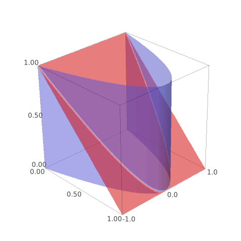 p2 = implicit_plot3d((z-1+x), (x,0, 1), (y,-1, 1), (z,0, 1),color='red', opacity=0.5)