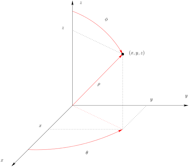 Se uma grandeza for descrita em coordenadas cartesianas por uma uma função \(F:A\subset\mathbb{R}^3\to \mathbb{R}\), a mesma grandeza será descrita em coordenadas esféricas por \(F\circ T\), ou seja por \((\rho,\theta,\phi)\mapsto G(\rho,\theta,\phi)=F\circ T (\rho,\theta,\phi)=F(\rho\cos \theta \operatorname{sen}\phi,\rho\operatorname{sen} \theta \operatorname{sen}\phi,\rho\cos\phi)\). Supondo \(A\) aberto e \(F\) diferenciável também \(G\) será diferenciável e \[DG(\rho,\theta,\phi)=DF(T(\rho,\theta,\phi))DT(\rho,\theta,\phi)\] que explicitada nos permite obter relações entre as derivadas parciais de \(G\) e \(F\) tais como \[\frac{\partial G}{\partial \rho}= \cos\theta \operatorname{sen}\phi \frac{\partial F}{\partial x}+ \operatorname{sen}\theta \operatorname{sen}\phi \frac{\partial F}{\partial y} + \cos\phi \frac{\partial F}{\partial z}\]