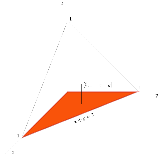 Exemplo. Considere \(P=\{(x,y,z)\in\mathbb{R}^3: x\geq 0, y\geq 0, z\geq 0, x+y+z\leq 1\}\) e \(g:P\to\mathbb{R}\) definida por \(g(x,y,z)=x y z\) admitindo que \(g\) é integrável em \(P\). Vamos considerar os dois pontos de vista naturais para determinar os limites de integração de integrais iterados. Supondo que optamos por ordem de integração correspondente a considerar sucessivamente integrações em ordem a \(z\), \(y\) e \(x\) podemos começar por considerar \[\iiint_P g = \iint_{\operatorname{proj}_{XY}(P)}\left(\int_{C_{(x,y)}(P)}g(x,y,z)\, dz\right)dx\,dy\] ou \[\iiint_P g= \int_{\operatorname{proj}_X(P)}\left(\iint_{C_x(P)}g(x,y,z)\, dy\,dz\right)dx\] e depois exprimir os integrais duplos como integrais iterados. [Embora o resultado final seja o mesmo o raciocínio será claramente diferente para cada um dos processos não havendo a priori um método mais aconselhável para atacar o problema.] Aqui usámos notações para projecções e cortes na linha do que se já tinha feito atrás em dimensão 2. Em cada uma das linhas seguintes a primeira igualdade corresponde ao que poderia ser a definição formal destes conjuntos e a segunda identifica estes conjuntos neste exemplo \[\begin{align*}\operatorname{proj}_{XY}(P) & =\left\{(x,y)\in\mathbb{R}^2:\exists_{z} (x,y,z)\in P \right\} \\ & =\left\{(x,y)\in\mathbb{R}^2: x\geq 0, y\geq 0, x+y\leq 1 \right\} \\ \operatorname{proj}_{X}(P) & = \left\{x\in\mathbb{R}:\exists_{(y,z)} (x,y,z)\in P \right\}=[0,1] \\ C_{(x,y)}(P) & = \left\{z\in\mathbb{R}: (x,y,z)\in P \right\} =[0, 1-x-y ] \\ C_{x}(P) & = \left\{(y,z)\in\mathbb{R}^2: (x,y,z)\in P \right\}\\ & = \left\{(y,z)\in\mathbb{R}^2: y\geq 0, z\geq 0, y+z\leq 1-x \right\} \end{align*} \]